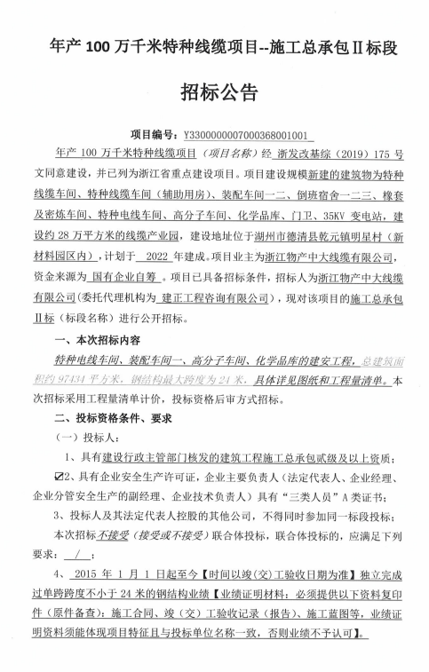 年產(chǎn)100萬(wàn)千米特種線纜項(xiàng)目--施工總承包Ⅱ標(biāo)段招標(biāo)公告